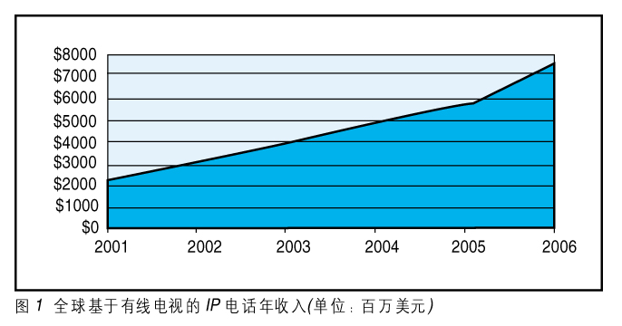 有線電視運(yùn)營商在尋找使用有線電視基礎(chǔ)網(wǎng)絡(luò)HFC的新服務(wù),創(chuàng)造新的經(jīng)濟(jì)增長點(diǎn),提供數(shù)據(jù)、語音、圖像綜合的服務(wù);谟芯電視系統(tǒng)的IP電話將是第一個(gè)最有可能推出的新服務(wù)。2002年InStat/MDR的分析報(bào)告說2006年基于有線電視的IP電話網(wǎng)將達(dá)到US$75億的年收入,如圖1所示。