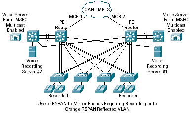 在第三層,所有語(yǔ)音(電話)接入VLAN都在語(yǔ)音服務(wù)器群第三層交換機(jī)上端接,以確保電話到網(wǎng)關(guān)和Call Manager的流量脫離PE路由器。這還可以建立一個(gè)終端組播區(qū),因?yàn)樵诓渴?/span>GTAA項(xiàng)目時(shí),Cisco Catalyst 6500 MPLS網(wǎng)絡(luò)還不支持組播。
