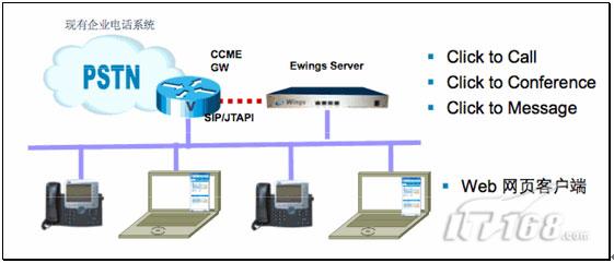 UC點(diǎn)點(diǎn)通解決方案,由網(wǎng)關(guān),服務(wù)器,IP電話和客戶(hù)端組成,如圖5所示: