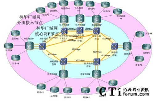 據(jù)神華集團(tuán)信息管理部廣域網(wǎng)項(xiàng)目負(fù)責(zé)人說(shuō):“該項(xiàng)目建成后將是一個(gè)建設(shè)在高速傳輸網(wǎng)平臺(tái)之上,并利用其提供的線路構(gòu)成廣域網(wǎng)核心節(jié)點(diǎn)之間的互聯(lián)線路,網(wǎng)絡(luò)拓?fù)湓?個(gè)核心節(jié)點(diǎn)和以北京節(jié)點(diǎn)為中心直連7個(gè)核心節(jié)點(diǎn)的放射型622M環(huán)形+放射混合性企業(yè)頂級(jí)骨干廣域數(shù)據(jù)網(wǎng)絡(luò)結(jié)構(gòu)。該網(wǎng)絡(luò)結(jié)構(gòu)可避免任一段光纜中斷造成某節(jié)點(diǎn)直連線路和環(huán)線同時(shí)中斷的可能性,即對(duì)網(wǎng)絡(luò)單點(diǎn)故障實(shí)現(xiàn)環(huán)路保護(hù)。同時(shí),網(wǎng)絡(luò)中斷到恢復(fù)的周期大大縮短:傳輸系統(tǒng)中SDH的環(huán)路自愈從中斷到恢復(fù)周期為50ms,網(wǎng)絡(luò)節(jié)點(diǎn)之間通過IGP的路由收斂,從中斷到恢復(fù)的周期約為200ms!