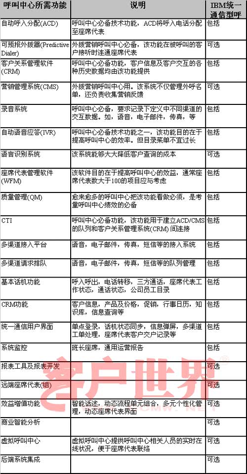 對(duì)于統(tǒng)一通信型呼叫中心的功能概況,筆者以IBM統(tǒng)一通信型呼叫中心提供的功能為例,供企業(yè)客戶及合作伙伴參考(見表二)。