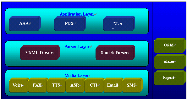 SSurnon-IVR系統(tǒng)分為支撐系統(tǒng)和應(yīng)用服務(wù)器兩大部分,支撐系統(tǒng)的核心為Browser Layer。由它來解釋和執(zhí)行流程的業(yè)務(wù)邏輯,由Media