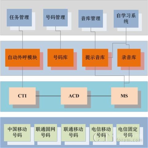 這個層次主要包括ACD、CTI和MS三個模塊。其中:   負(fù)責(zé)信令處理。即通過分析交換機(jī)發(fā)過來的掛機(jī)信令,保存被叫用戶號碼狀態(tài)。    用于指示ACD外呼被叫號碼,以及上報(bào)外呼結(jié)果到上一層。    進(jìn)行具體的錄音,以及Tone音識別、提示音識別等。