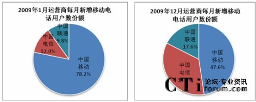 考查三大運(yùn)營商2009年的每月新增用戶數(shù)份額:中國移動(dòng)每月新增用戶數(shù)份額從1月的78.2%下降到12月的47.6%,顯然,中國移動(dòng)每月用戶增速逐漸放緩,而中國電信和中國聯(lián)通的每月新增用戶數(shù)份額呈增長趨勢(shì)。