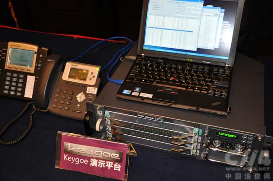 現(xiàn)場兩套演示系統(tǒng)中,一套以Keygoe 3000系列機(jī)箱承載最新研發(fā)的高密度VoIP資源處理板PFBT480X,實(shí)現(xiàn)整機(jī)最大1920路VoIP語音處理,展示了keygoe 3000多媒體交換機(jī)在大容量IP呼叫和語音處理的卓越性能。另一套則展示了最新的Keygoe1001系列多媒體交換機(jī),該機(jī)通過內(nèi)置主控CPU板,將語音交換、語音處理以及應(yīng)用程序整合在一個(gè)高為1U的物理機(jī)箱中,為中小型規(guī)模業(yè)務(wù)應(yīng)用提供具有較強(qiáng)綜合性、靈活性和完整性的運(yùn)營平臺。