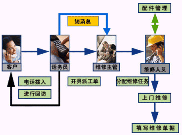 后臺客服應(yīng)用子系統(tǒng)建成后,客戶的投訴被自動導(dǎo)入,生成投訴單和維修單,自動轉(zhuǎn)發(fā)給維修部,安裝部等專業(yè)部門進(jìn)行處理,處理完后,系統(tǒng)會安排話務(wù)員進(jìn)行回訪,消費者的處理意見和滿意度將被忠實地記錄下來,進(jìn)一步充實到客服數(shù)據(jù)庫中以指導(dǎo)企業(yè)的生產(chǎn)研發(fā)。
