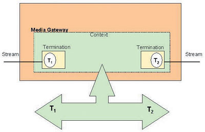 H.248工作在主從模式,并定義了連接模型(參見圖2)。連接模型中有終端、流以及上下文。終端是出/入分組網(wǎng)絡的媒體流的連接,它允許信號應用到媒體流上,如發(fā)送忙音; 也允許從媒體流中接受發(fā)生的事件,如收到DTMF信號。上下文則是將終端上媒體流混合并橋接在一起,并描述媒體流之間的關系。