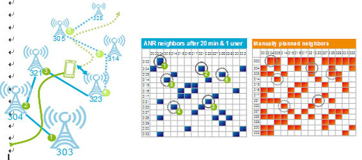 ANR盡管目前在LTE還沒有商用,但在多個歐美運營商的測試中,愛立信產(chǎn)品表現(xiàn)良好。如下圖ANR測試中,僅使用一個移動終端在20分鐘內(nèi)通過了20個基站覆蓋區(qū)域,檢測到的鄰區(qū)關(guān)系如藍圖所示,相比橙色圖的手工配置鄰區(qū),所有必要的鄰區(qū)關(guān)系(有數(shù)字標(biāo)示)悉數(shù)獲得。而且這僅僅動用了一個終端,如果相關(guān)區(qū)域內(nèi)都有終端分布,檢測的速度會有極大提高。