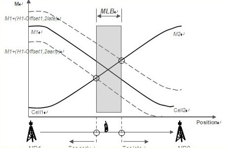 過早、過晚切換是由于目標(biāo)小區(qū)切換門限過低和過高所致。對應(yīng)過早和過晚臨界切換門限之間的區(qū)間就是合理的移動性優(yōu)化范圍。頻內(nèi)的負(fù)載均衡也可以通過調(diào)整切換門限值來引導(dǎo)用戶和負(fù)荷由高負(fù)荷小區(qū)遷移至低負(fù)荷小區(qū),很顯然可調(diào)的門限區(qū)間就是移動性優(yōu)化允許的范圍。這個范圍對應(yīng)相鄰小區(qū)的重覆蓋面積,在LTE中理論上大概相當(dāng)于正常小區(qū)面積的15%,可操作的價值不是很大。愛立信更傾向于異頻或者異系統(tǒng)的負(fù)荷均衡方案,增益比較明顯。如下圖,一個終端從左至右移動,M1、M2分別是接收到eNB1和eNB2的信號強度曲線,兩條曲線相交點對應(yīng)的地理位置處終端接收到的信號強度相同,對cell1到cell2的切換,下面的虛線對應(yīng)過早切換臨界,上面的虛線對應(yīng)過晚切換臨界,兩線與M2相交點對應(yīng)合理切換門限區(qū)間,也是頻內(nèi)負(fù)載均衡MLB的可調(diào)范圍。
