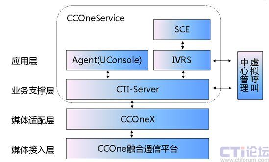 CCOneX即媒體適配層,主要實現(xiàn)以下兩方面功能:    通過適配層的處理后,CTI-Server即可進(jìn)行統(tǒng)一的控制和處理。