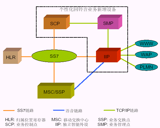 3. 智能網(wǎng)方式使用移動智能網(wǎng)中的信令控制節(jié)點(SCP)實現(xiàn)智能業(yè)務(wù)的業(yè)務(wù)邏輯,新增的智能外設(shè)用于為用戶提供回鈴音和用戶管理功能。 個性化回鈴音業(yè)務(wù)是基于智能網(wǎng)系統(tǒng)的一個新業(yè)務(wù),在智能網(wǎng)中增加新的業(yè)務(wù)控制點(SCP)和獨立智能外設(shè)(IIP)。為此只需要為此業(yè)務(wù)加入基于Intel平臺的SCP和IP即可,前者是智能網(wǎng)體系中的業(yè)務(wù)控制設(shè)備,用于實現(xiàn)智能業(yè)務(wù)的業(yè)務(wù)邏輯,使用的是Intel高性能的c-PCI平臺,支持高可靠性的冗余備份,提供業(yè)務(wù)呼叫控制和業(yè)務(wù)數(shù)據(jù)維護功能;后者是智能網(wǎng)獨立外設(shè),使用的是Inetl Dialogic的相關(guān)語音板卡,用于為個性化回鈴音用戶提供語音(回鈴音)、以及業(yè)務(wù)管理等功能。優(yōu)點是無須改動現(xiàn)網(wǎng)上MSC/SSP 的軟件,通過采用SCP 查詢被叫用戶狀態(tài)的方式,只有當(dāng)被叫用戶處于空閑的情況下,才使用IIP 進行處理,可以減少系統(tǒng)負荷,降低SSP 與IIP 之間話路的占用。缺點是需要MSC支持智能網(wǎng)業(yè)務(wù)。