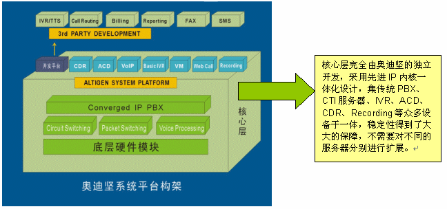 值得一提的是,在穩(wěn)定性上,奧迪堅IP一體化呼叫中心平臺系統(tǒng)構(gòu)架,從產(chǎn)品設(shè)計之初就突破了以住基于交換機或板卡的傳統(tǒng)模式,在一臺通訊服務(wù)器上高度融合了呼叫中心的所有常用功能,有效避免了復(fù)雜的網(wǎng)絡(luò)連接和眾多的各類交換機和外掛設(shè)備,各個設(shè)備相對獨立兼容性差所給呼叫中心系統(tǒng)所帶的穩(wěn)定性欠佳的隱患。除此之外,奧迪堅呼叫中心系統(tǒng)底層硬件模塊是在美國設(shè)計生產(chǎn)的,通過北美和中國的嚴(yán)格的電信入網(wǎng)測試;相對于硬件,平臺軟件也都是由奧迪堅自主開發(fā)設(shè)計的,針對不同的硬件采用不同的驅(qū)動模塊,軟硬一體在交換層又使用統(tǒng)一的邏輯接口,結(jié)構(gòu)清晰,層次合理,不僅保障了穩(wěn)定而且便于擴展(如下圖所示),整個系統(tǒng)作為一個整體統(tǒng)一擴展,不需要對不同的服務(wù)器分別進行擴展,有效避免了傳統(tǒng)呼叫中心構(gòu)建方式在擴展方面存在的復(fù)雜性問題以及高額的擴展費用。
