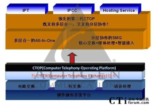 Telephony Operating Platform)平臺,在CTOP平臺設(shè)計(jì)中引入了核心交換、媒體處理與智能接入三層應(yīng)用架構(gòu)。在CTOP平臺上構(gòu)建呼叫中心系統(tǒng),既可兼容既有多層合一的All-In-One模式,也可采用分層協(xié)作的構(gòu)建模式,并適用于從小到大各種規(guī)模的呼叫中心!