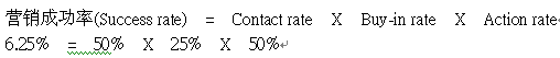 rate(接觸率,能夠聯(lián)系到客戶的比率), Buy-in rate(接受率,聯(lián)系到的客戶里面表達有興趣的比率), Action rate(成交率,表達有興趣的客戶里面真正付錢購買的比率)。一般而言,接觸率能達到50%算是不錯的名單,而接受率能達到25%算是產(chǎn)品、名單選擇登對,銷售技巧也到位,最后臨門一腳的成交率應該要能到50%算是達標了。以下列公式來表達(標準以上述的比率套用):