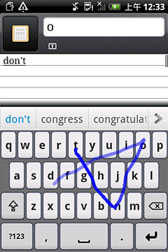 如圖所示,Nuance T9 Trace英文輸入方案對于各種不同的字母組合都能有效識別,像“google”這種既有連續(xù)又有間斷重復(fù)字母的單詞也不在話下,一次就能精準輸出。另外,該輸入法還可以省去標(biāo)點符號,如“don"t”“can"t”等單詞,用戶只需滑觸“d-o-n-t”這四個字母,輸入法就會自動識別。