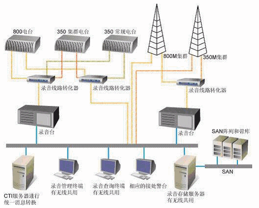 系統(tǒng)對無線通訊部分的800M TETRA集群、350M模擬集群、TETRA基地臺、350M常規(guī)基地臺、350M集群電臺等進行錄音。