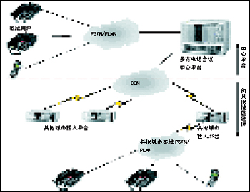 目前,根據(jù)建設(shè)思路中所提到的分期實(shí)施原則,第一期只完成本地多方電話會(huì)議中心平臺(tái)的建設(shè)。參加電話會(huì)議的各方用戶均直接通過(guò)公眾電話網(wǎng)撥入中心平臺(tái),由中心平臺(tái)統(tǒng)一接入并組織會(huì)議資源為用戶服務(wù),結(jié)構(gòu)如圖2所示。