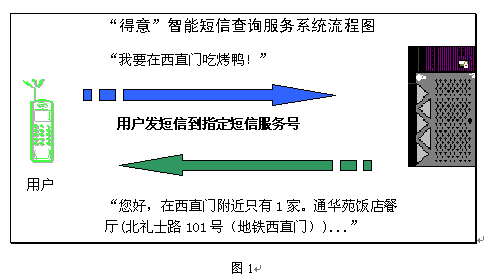 智能短信服務(wù),就是允許短信用戶在手機(jī)上直接以自然語(yǔ)言的形式輸入文字(而不是輸入復(fù)雜的代碼或操作繁瑣的菜單),系統(tǒng)能迅速、準(zhǔn)確地理解用戶的意思,提供周到的信息和服務(wù)。短信服務(wù)商可根據(jù)具體應(yīng)用領(lǐng)域定制一系列全新的智能短信業(yè)務(wù),如旅游交通、餐飲娛樂(lè)、金融證券、交友網(wǎng)聚、智力競(jìng)猜等受歡迎的服務(wù),將直接刺激用戶使用短信服務(wù)的興趣和頻率。得意公司提供的北京餐飲智能短信服務(wù)可以靈活、方便地引導(dǎo)用戶找到合適的餐飲信息(圖1)