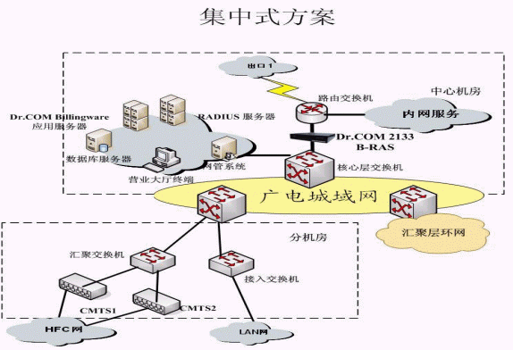 根據(jù)廣電城域網目前網絡的規(guī)模,以及以后的擴展,采用集中接入認證與計費,統(tǒng)一管理的方案,集中接入指:接入服務器部署在各個匯聚層的匯聚點,即在網絡出口安裝寬帶接入服務器,由寬帶接入服務器對所有用戶進行身份認證、接入控制、實時計費、數(shù)據(jù)采集,并將賬單和訪問日志等傳送至綜合業(yè)務系統(tǒng)。統(tǒng)一管理指在中心機房就可以進行全部的管理,包括:網絡設備管理;用戶管理;經營策略管理;賬務管理;安全管理;數(shù)據(jù)分析。提供完整的用戶資料分析,使用習慣分析,運營統(tǒng)計等詳細分析報表。