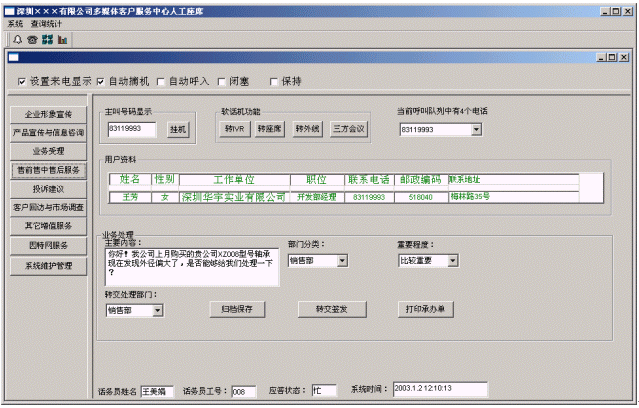 - 提高企業(yè)親切感:系統(tǒng)在人工服務(wù)狀態(tài)下,當(dāng)業(yè)務(wù)代表輸入客戶名稱時,系統(tǒng)即時將客戶與企業(yè)相關(guān)的信息顯示在座席終端上,使業(yè)務(wù)及時了解客戶,有針對性回答客戶問題,使客戶倍感親切。
