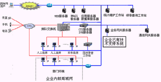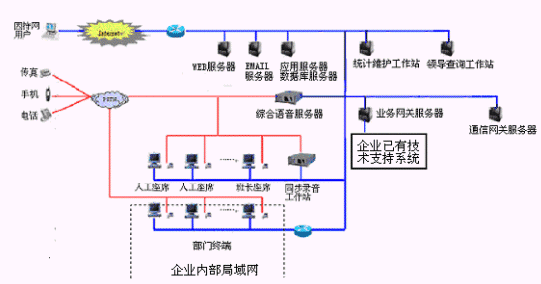 網(wǎng)上服務(wù)系統(tǒng):與INTENET結(jié)合,接受來自網(wǎng)上的呼叫請求,提高服務(wù)和營銷的質(zhì)量和效率。