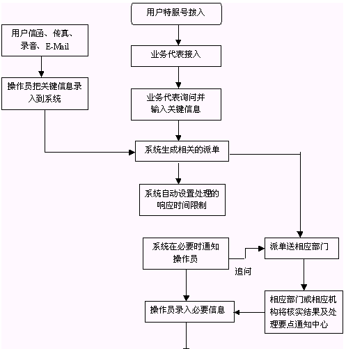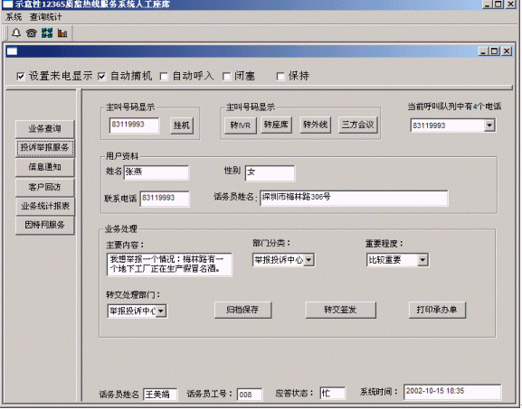 人民群眾打入電話后,當系統(tǒng)的自動語音應答子系統(tǒng)無法解決客戶問題時,客戶可選擇人工服務,由企業(yè)客戶服務代表直接接聽客戶電話,處理并解決客戶問題。此時客戶同座席話務人員直接溝通,并同時記錄下該客戶的聯(lián)系方式,將相關數據添加入系統(tǒng)數據庫;也可以在數據庫的支持下回答質量監(jiān)督咨詢、投訴等?蛻粢部梢赃x擇自動語音服務方式,根據系統(tǒng)的語音提示輸入按鍵,選擇類別,將自己的投訴和建議以及自己的聯(lián)系方式信息以留言錄音的方式保存在系統(tǒng)中。系統(tǒng)同時還支持自動傳真方式,客戶可以通過傳真機進入本系統(tǒng),通過按鍵選擇傳真方式,將自己的意見建議等的文本內容傳真給系統(tǒng),系統(tǒng)自動接受并存入數據庫。
