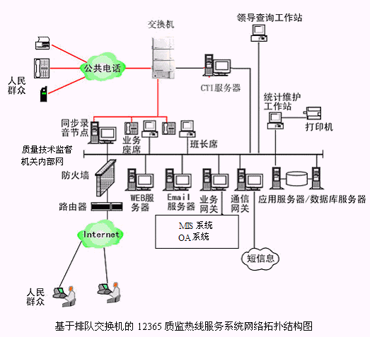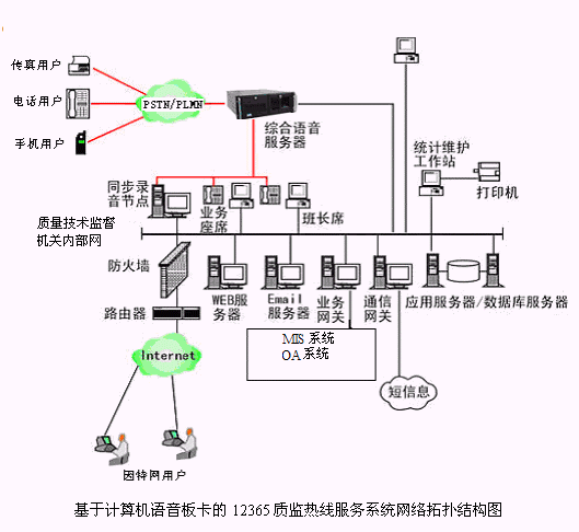本系統(tǒng)提供基于計算機語音板卡和排隊交換機兩種語音接入方式,都支持1號和7號信令線路的接入。對于大中型的12365質監(jiān)熱線服務系統(tǒng),可選用排隊交換機作為語音接入設備,保障系統(tǒng)的高可靠性和穩(wěn)定性;對于20個以下座席的中小型12365質監(jiān)熱線服務系統(tǒng),則建議使用基于計算機語音板卡的形式,可以減少企業(yè)投資,同時具有良好的系統(tǒng)性能。