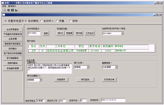 (2)提高家電企業(yè)親切感:系統(tǒng)在人工服務(wù)狀態(tài)下,當(dāng)業(yè)務(wù)代表輸入客戶名稱時,系統(tǒng)即時將客戶與家電企業(yè)相關(guān)的信息顯示在座席終端上,使業(yè)務(wù)及時了解客戶,有針對性回答客戶問題,使客戶倍感親切。