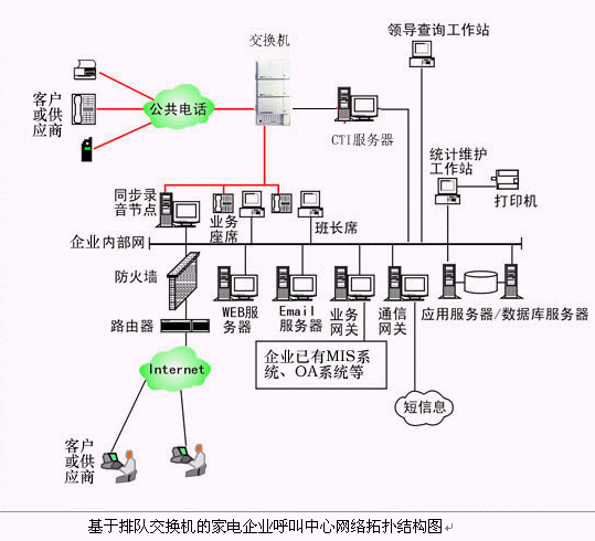 對于大中型的家電企業(yè)呼叫中心系統(tǒng),可選用排隊交換機作為語音接入設(shè)備,保障系統(tǒng)的高可靠性和穩(wěn)定性;