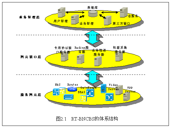 RT-BNCBS管理計費平臺從邏輯上分為三層:服務網(wǎng)元層、網(wǎng)元接口層和業(yè)務管理層。如圖1所示。
