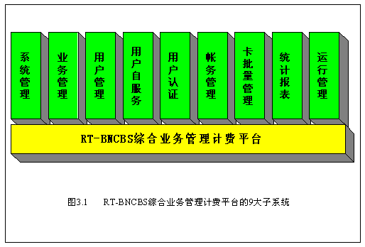 從系統(tǒng)接口角度,我們把RT-BNCBS綜合業(yè)務管理計費平臺分成9大子系統(tǒng),如圖4.1所示: