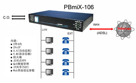在21世紀的今日,隨著網絡應用的普及,無論是個人或企業(yè)對于交換機的觀念若仍拘泥于傳統(tǒng)的思維,將是落伍的。免費網絡電話、分散式系統(tǒng),將是傳統(tǒng)交換機 在增加語音信箱/自動總機功能之后,系統(tǒng)機制的重大變革。本公司推出的PBmaX/PBmiX系列IP-PBX,不但將上述所有功能整合于一體,進一步可內建公司VPN、Web服務器、GateKeeper等功能,呈現(xiàn)出數(shù)字交換機的全新風貌,并將新的電話使用觀念帶進企業(yè)、SOHO辦公室與家庭內。