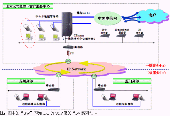 另一方面,OKI則擁有構(gòu)筑大規(guī)模IP電話的豐富經(jīng)驗(yàn),從最初的窄帶網(wǎng)絡(luò)到最近的寬帶網(wǎng)絡(luò),OKI一直在提供著最適合使用用戶環(huán)境的、追求音質(zhì)的VoIP產(chǎn)品。伴隨著寬帶網(wǎng)絡(luò)在企業(yè)市場(chǎng)中日益深入的運(yùn)用,及呼叫中心市場(chǎng)中呈現(xiàn)的最新需求,OKI充分將IP技術(shù)運(yùn)用到呼叫中心系統(tǒng)中,推出IP型分散客服中心解決方案。所謂分散型系統(tǒng),是指用網(wǎng)絡(luò)將分散在各個(gè)點(diǎn)的多個(gè)呼叫中心連接起來,作為一個(gè)大規(guī)模中心統(tǒng)一運(yùn)用的系統(tǒng)。