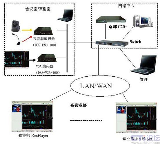 在分析了華安證券的實(shí)際需求和網(wǎng)絡(luò)環(huán)境以后,決定采用一套DSS-R-C20+來(lái)組建整個(gè)流媒體系統(tǒng)。系統(tǒng)由媒體采集系統(tǒng)視音頻編碼器(DSS-ENC-100)/VGA編碼器(DSS-ENC-100),流媒體處理和錄制系統(tǒng)(C20+)和客戶端RecPlayer組成。通過(guò)此系統(tǒng)可以實(shí)現(xiàn)語(yǔ)音、視頻和計(jì)算機(jī)桌面的同步實(shí)時(shí)直播、錄制和點(diǎn)播。系統(tǒng)的結(jié)構(gòu)圖如下: