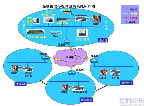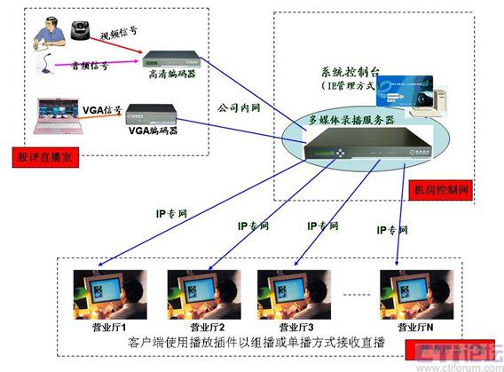 如上圖所示,在多媒體股評直播室中,股評師的講解圖像和聲音以及電腦中分析數(shù)據(jù)同步傳輸采集到控制機(jī)房中,通過多媒體錄播服務(wù)器直播模塊的組播方式將信息傳達(dá)給全國遍布的營業(yè)網(wǎng)點(diǎn),實(shí)現(xiàn)股評直播的需求。(權(quán)威股評師將在每天下午股市休市后對一天當(dāng)中股票大盤做一次全面的分析,并對本周或某行業(yè)的形式做一個(gè)全面的總結(jié),并對未來形勢做出判斷。)