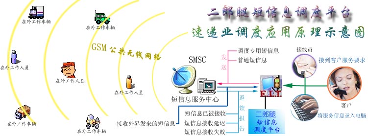 二郎腿短信息調(diào)度平臺(tái)是利用目前社會(huì)上大眾普遍擁有手機(jī)的現(xiàn)成資源,通過移動(dòng)通訊公司提供的短信息服務(wù)功能作為通信信道,直接對(duì)手機(jī)進(jìn)行低層操作控制,以“收發(fā)短信息”的方式來實(shí)現(xiàn)信息的傳遞(通信資費(fèi)標(biāo)準(zhǔn)與在手機(jī)上收發(fā)短信相同)。調(diào)度平臺(tái)還對(duì)每條發(fā)出的信息的接收狀態(tài)進(jìn)行跟蹤,確保信息能被安全