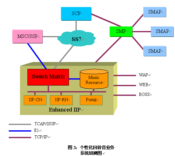 個性化回鈴音業(yè)務(wù)是基于智能網(wǎng)平臺實現(xiàn)的全新增值智能業(yè)務(wù),采用被叫簽約信息T-CSI觸發(fā)的方式。具體實現(xiàn)時利用現(xiàn)有智能網(wǎng)結(jié)構(gòu),將業(yè)務(wù)邏輯加載在SCP上,MSC/SSP根據(jù)用戶的歸屬HLR中的T-CSI信息,觸發(fā)智能業(yè)務(wù)到用戶歸屬的SCP上,并進(jìn)行相應(yīng)的業(yè)務(wù)控制處理。在呼叫過程中,由SCP控制獨立IP,向用戶提供音樂回鈴音。其中的Switch Matrix即為東信CS21-IPS設(shè)備,為IIP-CN的實現(xiàn)提供了TCAP/SCCP/MTP的信令功能,為IIP-RN提供了ISUP信令和前置交換功能。作為穩(wěn)定可靠的前置交換平臺,為運營商提供有效的增值空間,為用戶提供了優(yōu)質(zhì)的服務(wù)。