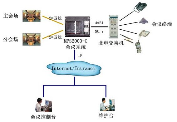 該會(huì)議系統(tǒng)通過4個(gè)數(shù)字中繼,與北電用戶交換機(jī)互連,采用PRI信令。與視頻會(huì)議系統(tǒng)主會(huì)場采用四線音頻接口接主會(huì)場調(diào)音臺(tái),保證與視頻會(huì)議系統(tǒng)音頻的無縫對(duì)接。通過以太網(wǎng)口與局域網(wǎng)連接,實(shí)現(xiàn)維護(hù)管理及會(huì)議控制等功能。