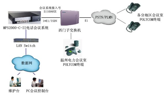 MPS2000-C電話會議系統(tǒng)通過數(shù)字中繼(采用ISDN信令)與溫州電力原有的西門子交換機互聯(lián),作為會議應(yīng)用服務(wù)器,為溫州電力原有電話網(wǎng)絡(luò)內(nèi)的用戶提供電話會議功能。