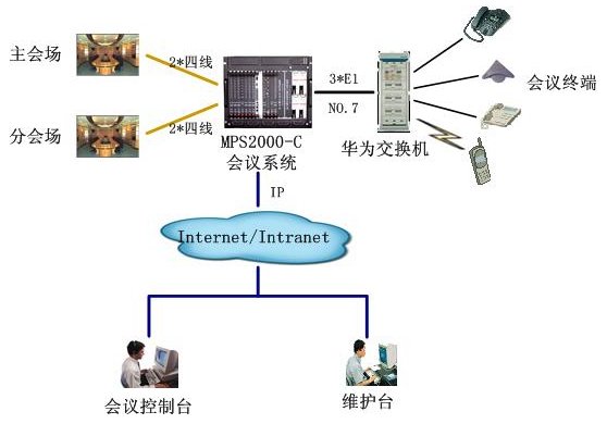 該會(huì)議系統(tǒng)和廊坊電力的會(huì)議系統(tǒng)組網(wǎng)方式相同,通過(guò)3個(gè)數(shù)字中繼,與華為用戶(hù)交換機(jī)互連,通信采用NO.7信令。4路4線(xiàn)中2路接主會(huì)場(chǎng)調(diào)音臺(tái),2路接分會(huì)場(chǎng)調(diào)音臺(tái),實(shí)現(xiàn)會(huì)議室擴(kuò)音設(shè)備的接入。通過(guò)以太網(wǎng)口與D-LINK網(wǎng)絡(luò)交換機(jī)互連,接入秦皇島電力的局域網(wǎng),實(shí)現(xiàn)維護(hù)管理及會(huì)議控制等功能。