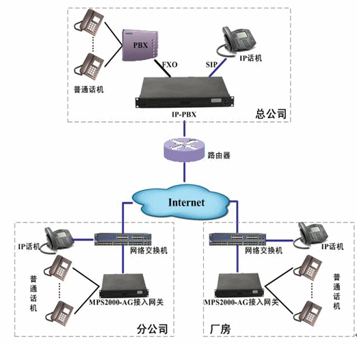 各分公司根據(jù)實際分機數(shù)配置相應(yīng)的接入網(wǎng)關(guān)或IP話機。接入網(wǎng)關(guān)和IP話機通過Internet注冊到位于總公司的IP-PBX上,實現(xiàn)了總部電話和分公司、廠房電話之間的通信、號碼直撥、來電顯示等功能。