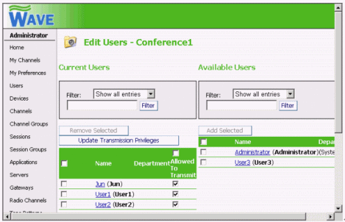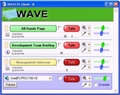 WAVE的使用方式為:管理員在服務(wù)器端建立IP電話會議,參加者使用本地計(jì)算機(jī)作為客戶端,通過耳機(jī)和麥克風(fēng)即可加入會議。一臺普通的奔四PC機(jī)可以支持?jǐn)?shù)千個(gè)會議,每個(gè)會議也允許數(shù)百個(gè)用戶參加。管理員可以分配用戶不同的權(quán)利:如講話,主持會議等等。