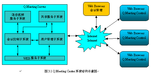 由于采用基于WEB的客戶端,Q.Meeting Center的部署是比較簡單的。只需按Q.Meeting Server的運行環(huán)境要求安裝配置好會議服務器即可。主持人和其他與會者使用普通PC機通過WEB瀏覽器訪問會議URL地址即可參加會議。