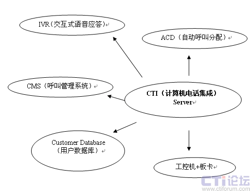 以CTI(計(jì)算機(jī)電話集成)為核心模塊,實(shí)現(xiàn)對(duì)IVR(交互式語(yǔ)音應(yīng)答)、ACD(自動(dòng)呼叫分配)、CMS(呼叫管理系統(tǒng))、板卡+工控機(jī)、Customer