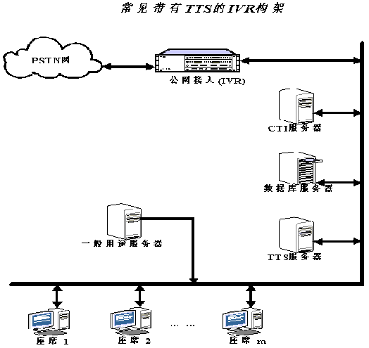在一般的CTI應(yīng)用系統(tǒng)中,都會(huì)有IVR(交互式語(yǔ)音應(yīng)答系統(tǒng))。IVR系統(tǒng)是呼叫中心的重要組成部分,通過IVR系統(tǒng),用戶可以利用音頻按健電話輸入信息,從系統(tǒng)中獲得預(yù)先錄制的數(shù)字或合成語(yǔ)音信息。具有TTS功能的IVR可以加快服務(wù)速度,節(jié)約服務(wù)成本,使IVR為呼叫者提供7*24小時(shí)的服務(wù)。