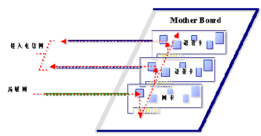 通過局域網(wǎng)傳遞語(yǔ)音數(shù)據(jù)本來就不能保證其時(shí)實(shí)時(shí)性,其結(jié)果就是用戶聽到的語(yǔ)音經(jīng)常斷續(xù),保證不了語(yǔ)音質(zhì)量。如果傳遞的語(yǔ)音數(shù)據(jù)是經(jīng)過壓縮的,語(yǔ)音數(shù)據(jù)本來就是通過TTS進(jìn)行合成的,再經(jīng)過壓縮,則音質(zhì)會(huì)有很大的損傷,因此同樣保證不了語(yǔ)音質(zhì)量。從上圖中我們可以看到,經(jīng)TTS合成的語(yǔ)音數(shù)據(jù)從局域網(wǎng)經(jīng)過網(wǎng)卡,再通過主板PCI(或ISA)總線進(jìn)入語(yǔ)音卡,最后進(jìn)入電信網(wǎng),同樣語(yǔ)音數(shù)據(jù)通過計(jì)算機(jī)主板經(jīng)PCI(或ISA)總線進(jìn)入語(yǔ)音卡也要求是實(shí)時(shí)的。這兩種實(shí)時(shí)性的要求會(huì)導(dǎo)致在接入量比較大的情況下,會(huì)給計(jì)算機(jī)的總線造成很大的負(fù)擔(dān)。因?yàn)榭偩的帶寬(數(shù)據(jù)吞吐量)是有限的。況且其它的板卡和接口(如聲卡、顯示卡等)也要直接或間接地占用總線。因此在接入量比較大的情況下,計(jì)算機(jī)的總線帶寬會(huì)成為一個(gè)比較關(guān)鍵的瓶頸。即便提高語(yǔ)音板卡的接入能力。在有大量電話接入的情況下,由于語(yǔ)音數(shù)據(jù)實(shí)時(shí)性的要求,也不能保證語(yǔ)音質(zhì)量。