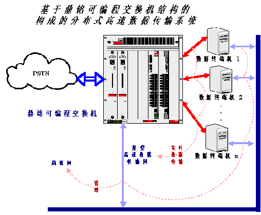 鼎銘高速數(shù)據(jù)傳輸板置于其可編程交換機(jī)內(nèi),外部可以和多臺(tái)PC或工控機(jī)相連,因?yàn)榭删幊探粨Q機(jī)可以級(jí)聯(lián),所以可以和外部連接的PC或工控機(jī)理論上沒有特別限制。這樣可編程交換機(jī)的內(nèi)部I/O總線(類比于PC機(jī)的PCI或ISA總線)就不再傳輸實(shí)時(shí)數(shù)據(jù)(如語(yǔ)音數(shù)據(jù)),而只負(fù)責(zé)非實(shí)時(shí)性的管理和信令數(shù)據(jù),語(yǔ)音或其它實(shí)時(shí)數(shù)據(jù)從外部PC直接傳入可編程交換機(jī)的高速數(shù)據(jù)傳輸板,然后通過交換直接進(jìn)入外部公共電信網(wǎng)(PSTN)。
