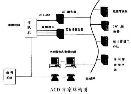 這種方案的核心思想是在專用交換機(jī)+ACD的基礎(chǔ)上擴(kuò)展路由和統(tǒng)計的功能,開放CTI -Link接口,用CTI技術(shù)實(shí)現(xiàn)通信和計算機(jī)的功能結(jié)合,再配以必要的語音和數(shù)據(jù)庫系統(tǒng),從而以強(qiáng)大的通信和計算機(jī)功能滿足呼叫中心的要求。