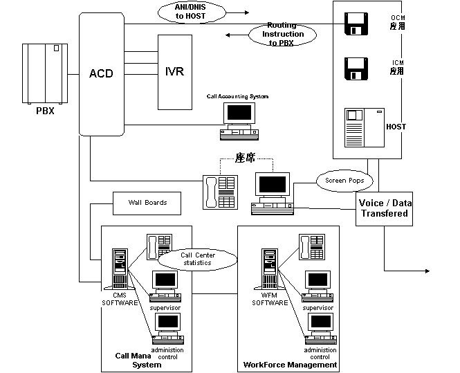 PSTN中繼線路經(jīng)由PBX路由轉(zhuǎn)接到呼叫中心中的個人電話或其它電話設(shè)備上,即常說的交換機(jī)(switch)。領(lǐng)先的交換機(jī)制造商,象朗訊(Lucent)、北電(Nortel)、Aspect和Rockwell,等等,都提供智能化的交換機(jī)硬件,其中最重要的是自動呼叫分配功能,自動呼叫分配器(ACD)是一種特殊的交換機(jī)(排隊機(jī)),用來處理大量密集的話務(wù)并根據(jù)技能優(yōu)先算法和空閑優(yōu)先算法將呼叫智能地轉(zhuǎn)接到合適的座席話務(wù)員。