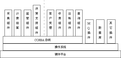 長途電話聯(lián)機(jī)計費(fèi)系統(tǒng) 長話計費(fèi)系統(tǒng)既包括計費(fèi)結(jié)算系統(tǒng),又包括營業(yè)服務(wù)系統(tǒng),功能比較多,數(shù)據(jù)處理流程也相對復(fù)雜。 簡單的傳統(tǒng)數(shù)據(jù)庫的機(jī)械化編程已很難滿足系統(tǒng)對大數(shù)據(jù)量的處理及靈活性等方面的要求,因此在這套系統(tǒng)中,我們采用了一些當(dāng)今業(yè)界的熱門技術(shù)。比如采用了CORBA軟總線思想和MQ Series消息管理隊(duì)列,也使之成為聯(lián)機(jī)計費(fèi)系統(tǒng)平臺的一次成功實(shí)施。其系統(tǒng)層次結(jié)構(gòu)圖如下: